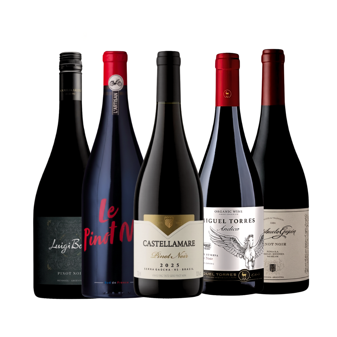O Kit Pinot Noir reúne cinco rótulos que expressam toda a elegância, complexidade e versatilidade de uma das uvas mais admiradas do mundo. Com exemplares do Brasil, Argentina, Chile e Nova Zelândia, este kit proporciona uma verdadeira jornada sensorial — dos estilos mais leves e frutados aos mais estruturados e sofisticados.